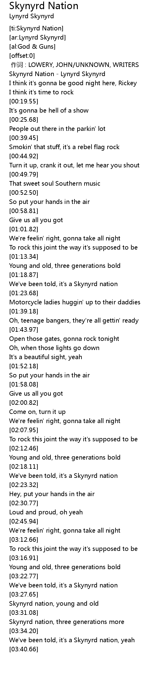 | [00:01.43] | Skynyrd Nation - Lynyrd Skynyrd |