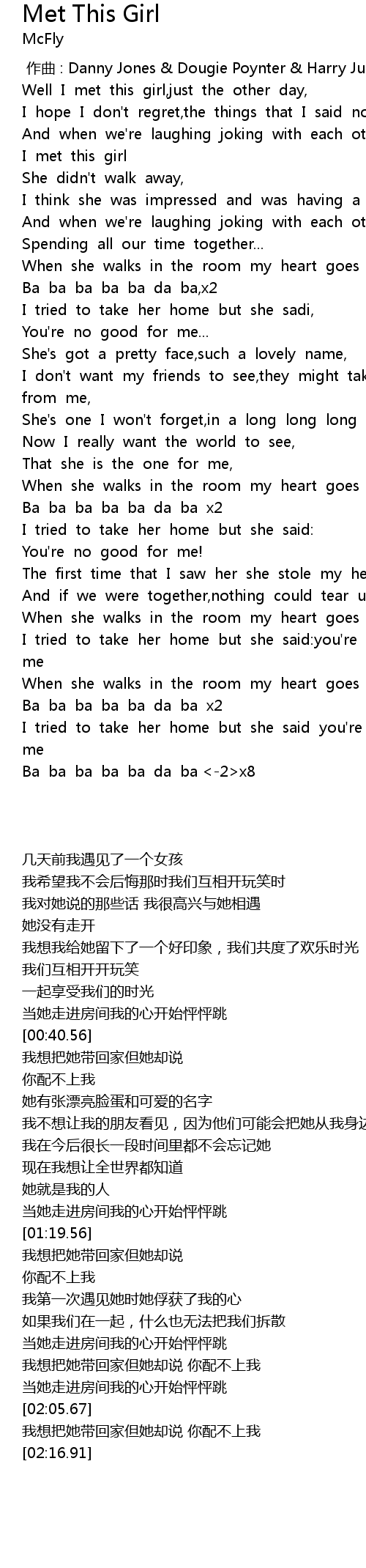 | [00:15.21] | And when we' re laughing joking with each other now, I' m glad I met this girl |