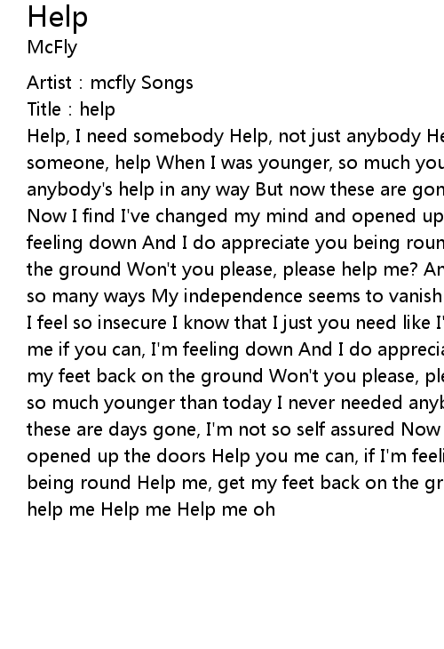 | [00:01.99] | Help, I need somebody Help, not just anybody Help, you know I need someone, help When I was younger, so much younger than today I never needed anybody' s help in any way But now these are gone, days I' m not so self assured Now I find I' ve changed my mind and opened up the doors Help me if you can, I' m feeling down And I do appreciate you being round Help me, get my feet back on the ground Won' t you please, please help me? And now my life has changed in oh so many ways My independence seems to vanish the haze in But every now and then I feel so insecure I know that I just you need like I' ve never done before Help me if you can, I' m feeling down And I do appreciate you being round Help me, get my feet back on the ground Won' t you please, please help me When I was younger, so much younger than today I never needed anybody' s help in any way But now these are days gone, I' m not so self assured Now I find I' ve my changed mind and opened up the doors Help you me can, if I' m feeling down And I do appreciate you being round Help me, get my feet back on the ground Won' t you please, please help me Help me Help me oh |