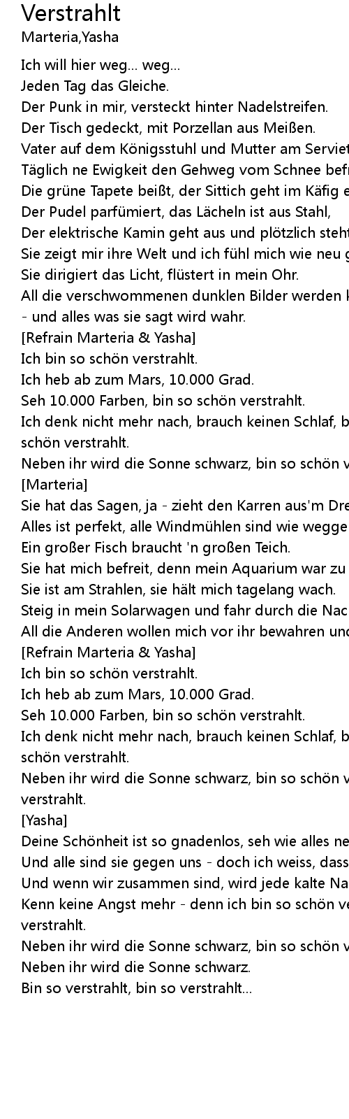 | Neben ihr wird die Sonne schwarz, bin so schön verstrahlt, bin so schön verstrahlt. | |