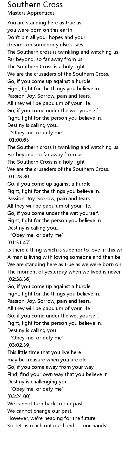 | [00:33.80] | We are the crusaders of the Southern Cross. |