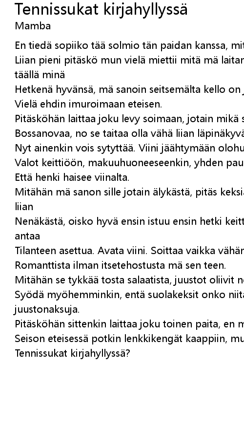 | Nyt ainenkin vois sytyttää. Viini jäähtymään olohuoneen verhot kiinni, | |