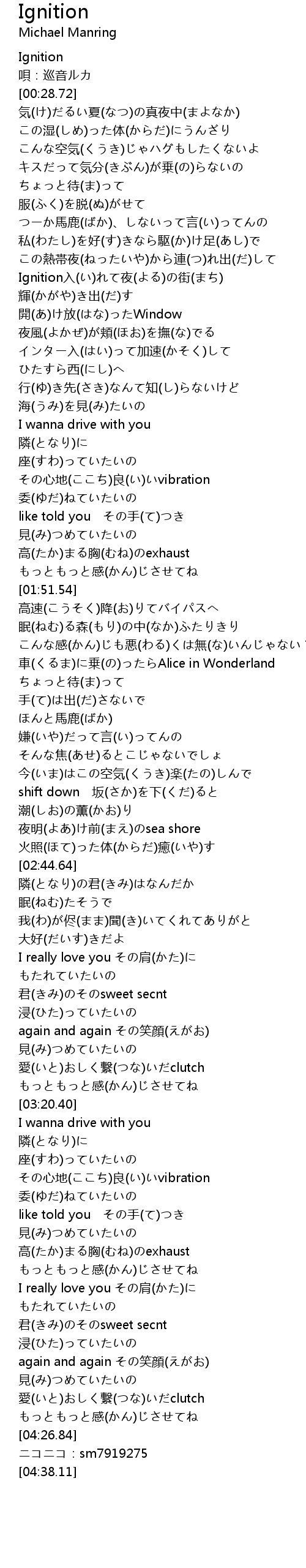 | [01:06.71] | Ignition入(い)れて夜(よる)の街(まち) |