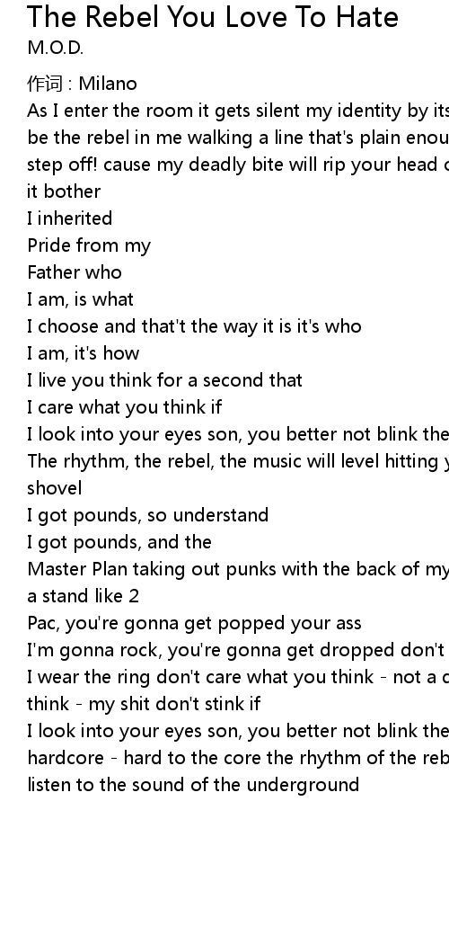 | I look into your eyes son, you better not blink the rebel you love to hate! hardcore hard to the core the rhythm of the rebel makes you want more so listen to the sound of the underground |