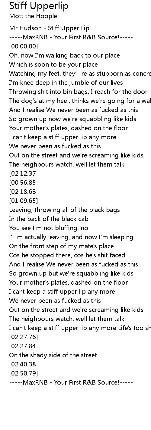 | [00:42.60] | I can't keep a stiff upper lip any more |