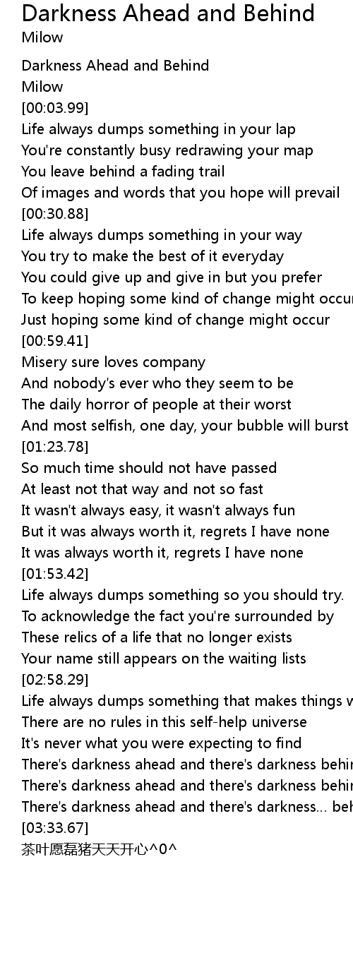 | [03:20.40] | There' s darkness ahead and there' s darkness behind |