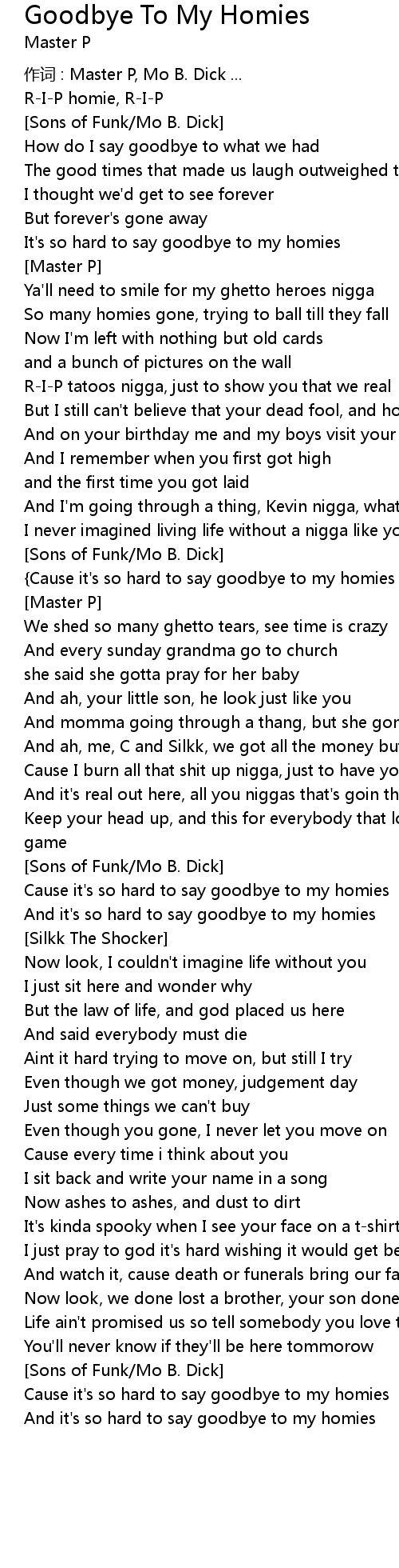 | {Cause it's so hard to say goodbye to my homies }x2 | |