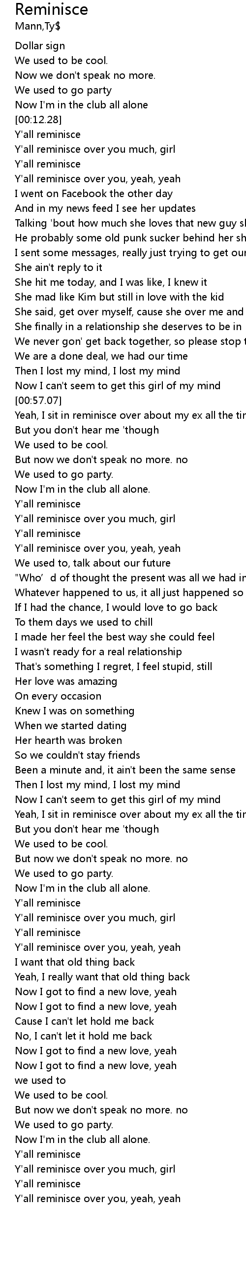 | [01:56.31] | Yeah, I sit in reminisce over about my ex all the time |