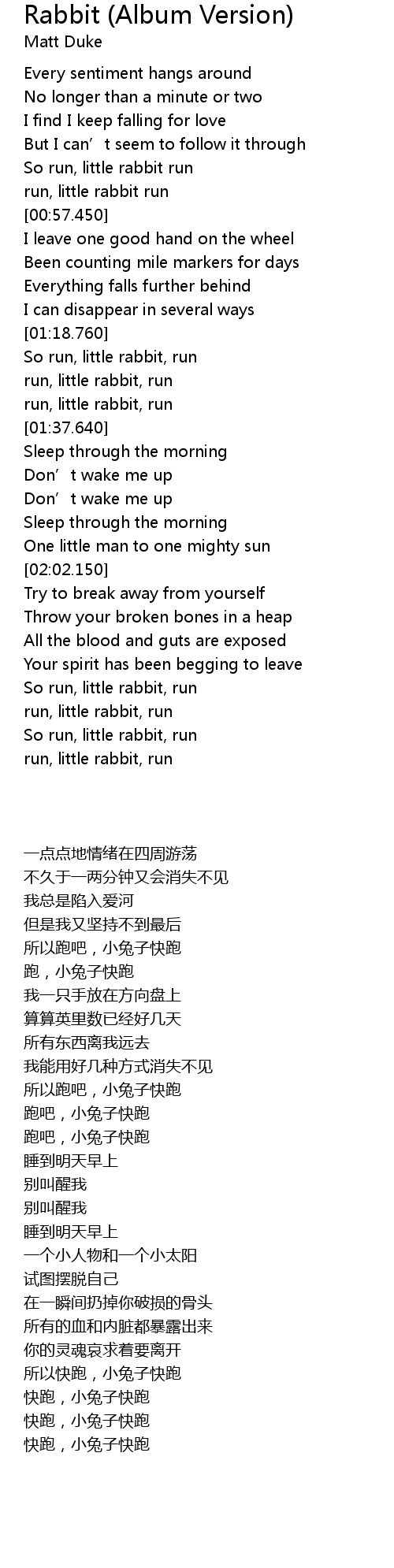 | [01:31.450] | run, little rabbit, run |