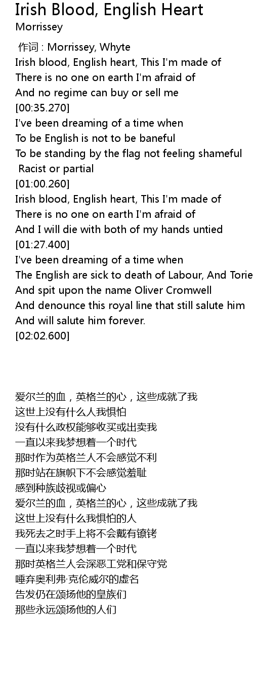 | [00:13.510] | Irish blood, English heart, This I'm made of |
