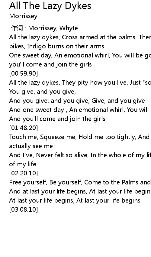 | [00:14.70] | All the lazy dykes, Cross armed at the palms, Then legs astride their bikes, Indigo burns on their arms |