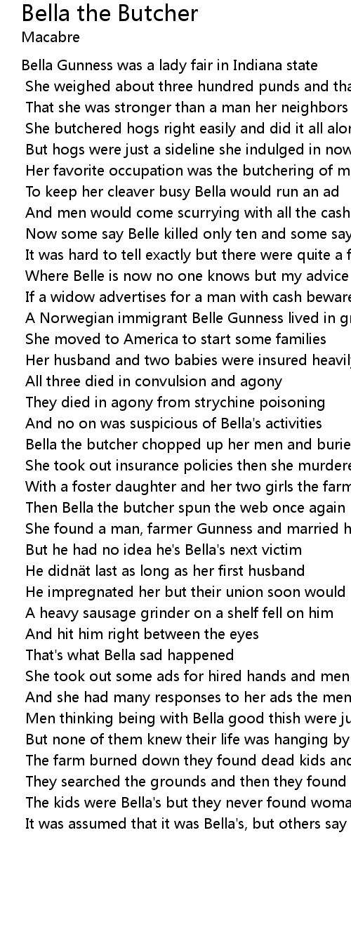 | Bella the butcher chopped up her men and buried them down by the hog pen | |