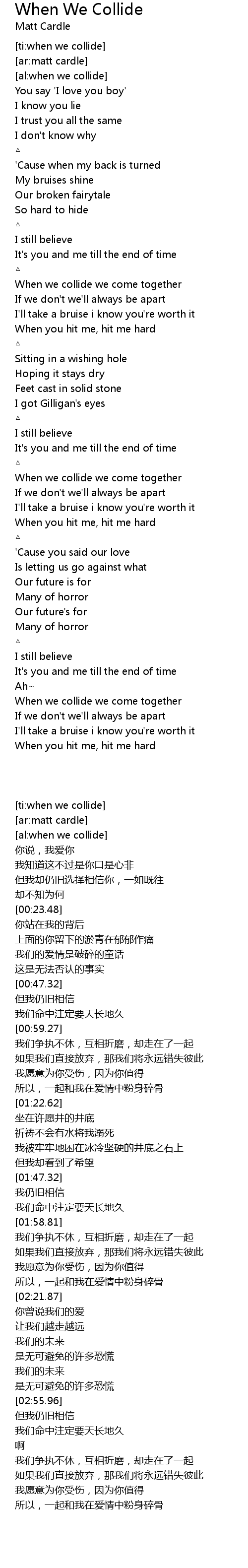 | [02:00.39] | When we collide we come together |