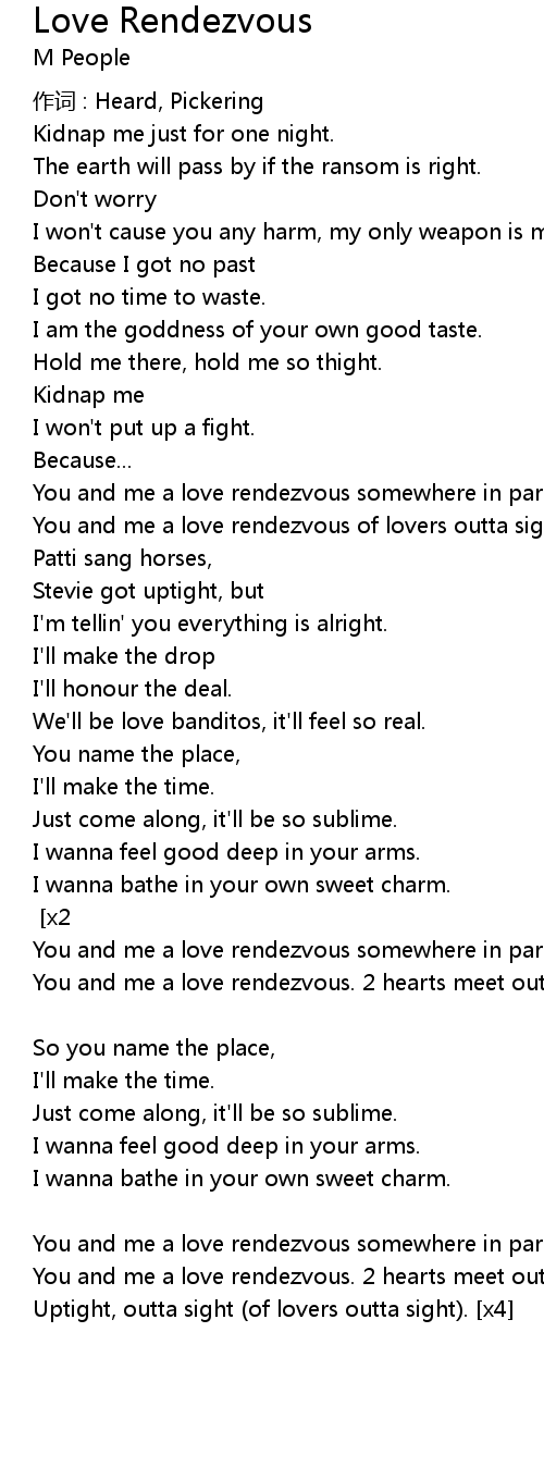 | You and me a love rendezvous. 2 hearts meet outta sight. | |