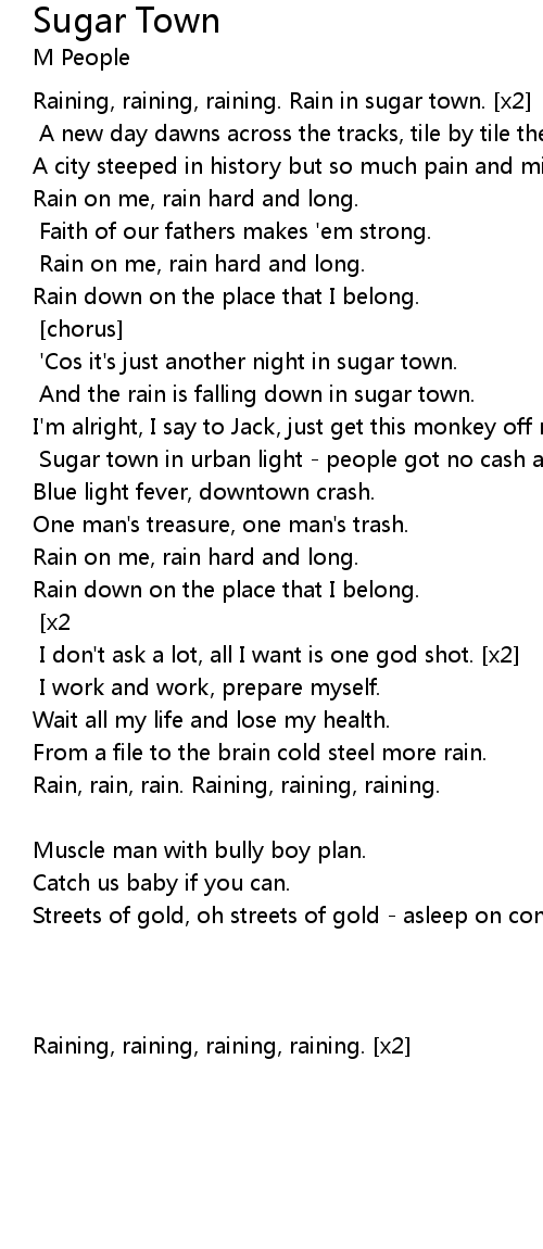| Raining, raining, raining. Rain in sugar town. [x2] | |