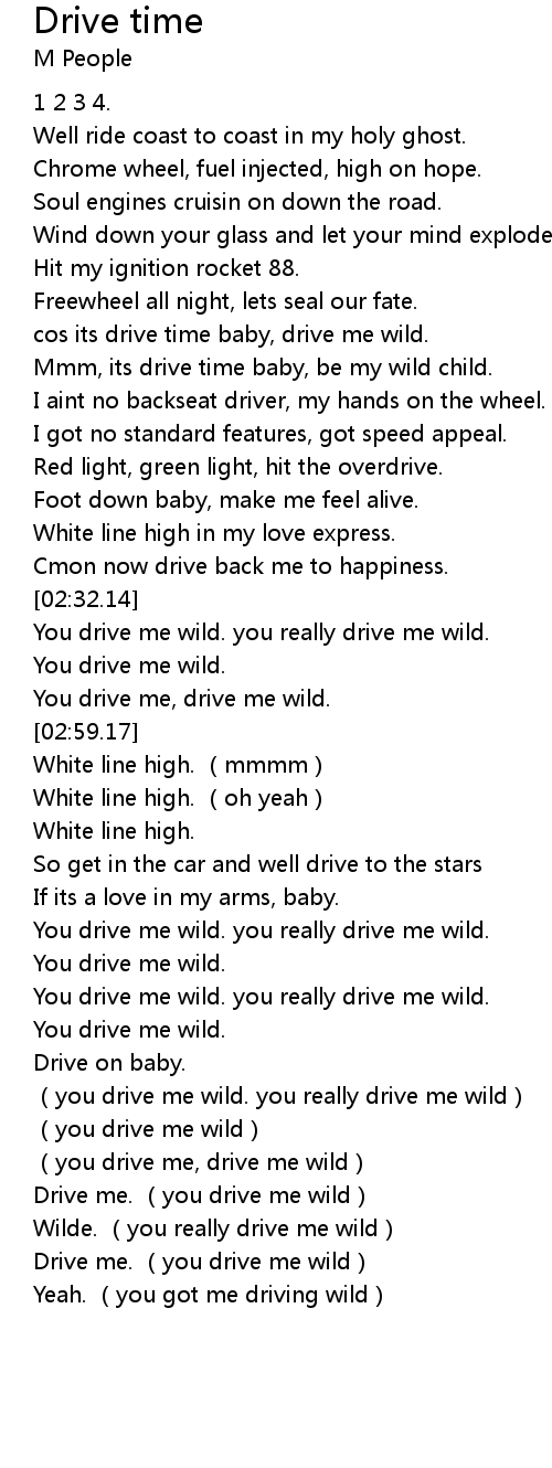 | [01:20.08] | cos its drive time baby, drive me wild. |