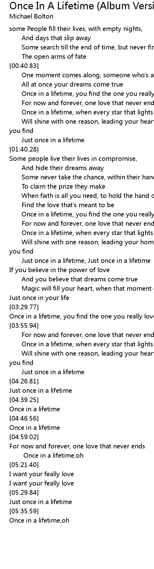 | [00:58.46] | Once in a lifetime, you find the one you really love |