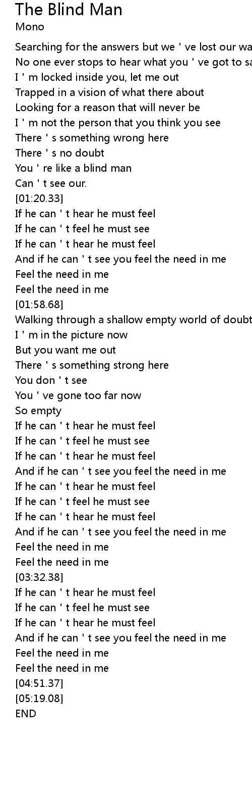 | [00:33.71] | No one ever stops to hear what you've got to say |