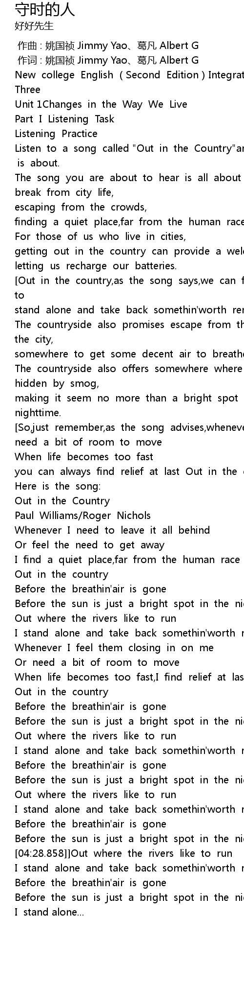 | [00:22.751] | Listen to a song called "Out in the Country"and see what it is about. |