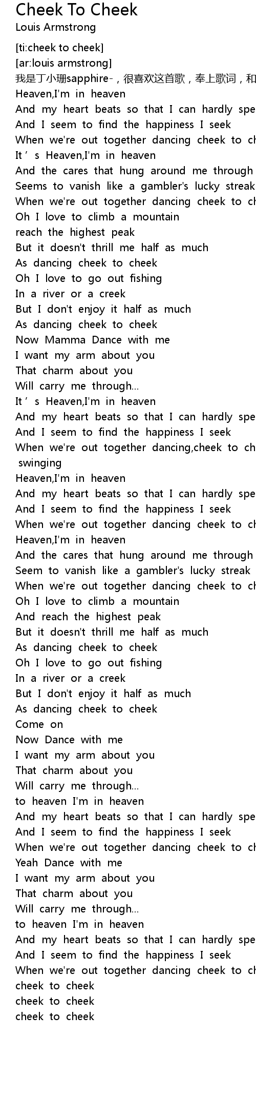| [02:20.760] | When we' re out together dancing, cheek to cheek , out together swinging |