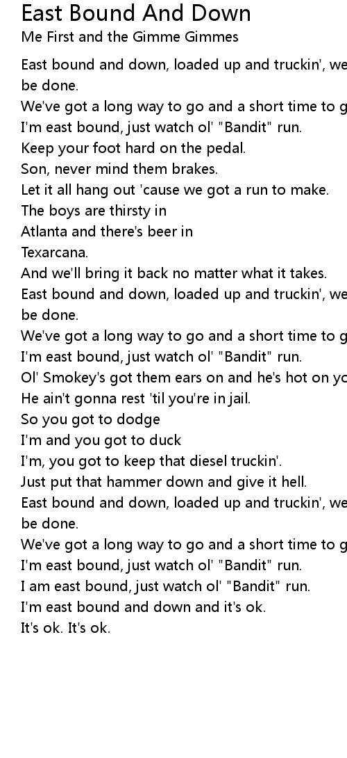 East bound and down, loaded up and truckin', we're gonna do what they say can't be done. |