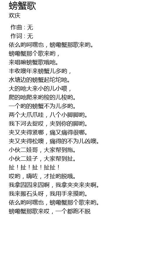 | [00:01.12] | 依么哟呵嘿也,螃嘞蟹那歌来哟。 |