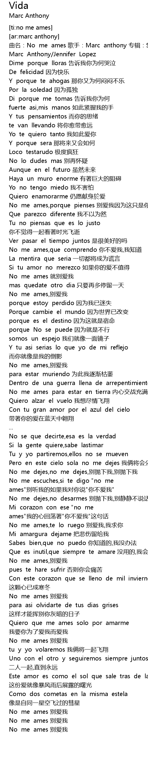 | [00:03.27] | 曲名:No me ames 歌手:Marc anthony 专辑:Sigo siendo yo |