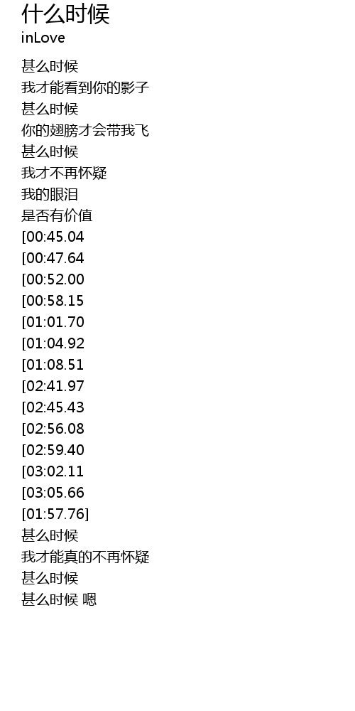 | [03:33.96][03:05.66][01:36.76] | 当我不再怀疑 |