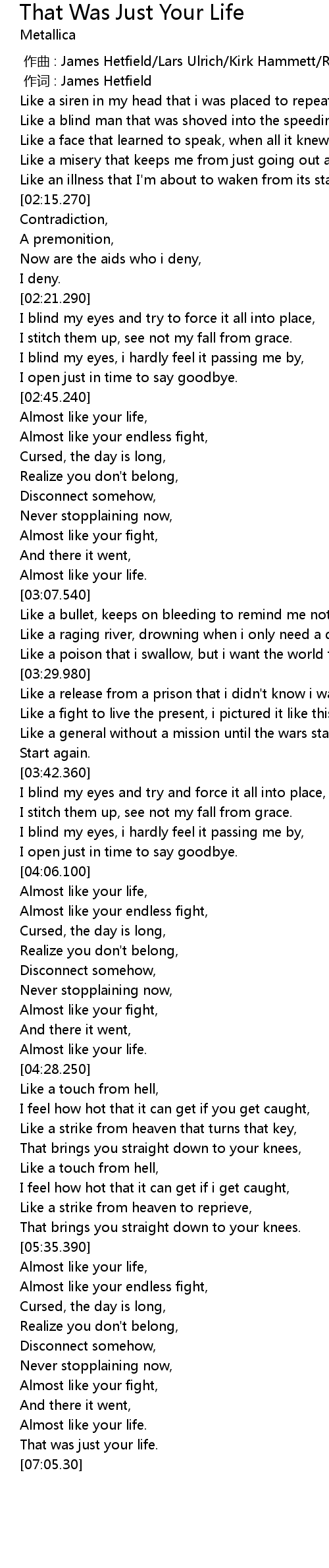 | [00:00.00] | 作曲 : James Hetfield/Lars Ulrich/Kirk Hammett/Robert Trujillo |