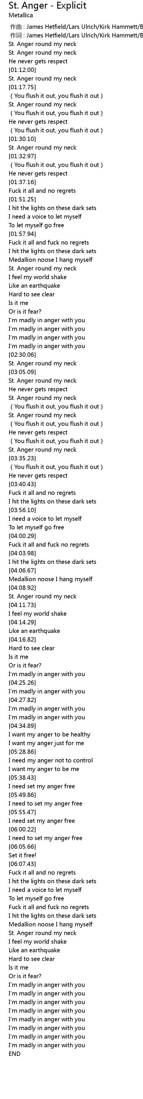 [00:01.00] 作词 : James Hetfield/Lars Ulrich/Kirk Hammett/Bob Rock