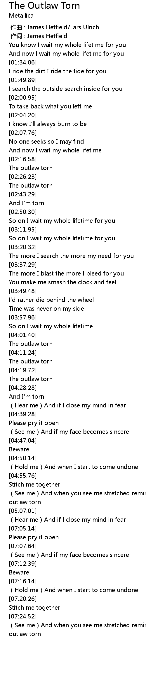 | [04:59.26] | See me And when you see me stretched remind me of what left this outlaw torn |