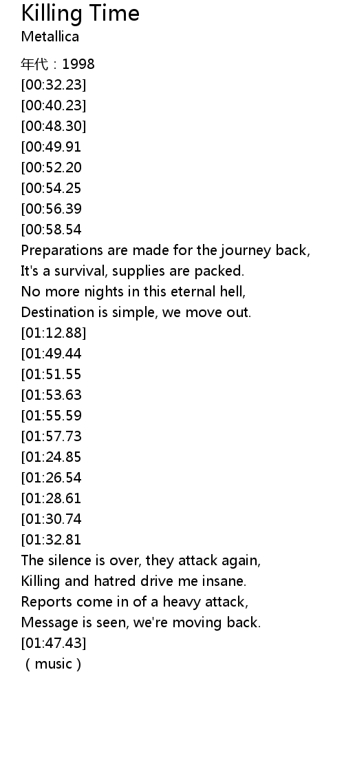 | [02:52.52][01:55.59][01:20.79] | Killing time - Aaha, killing time. |