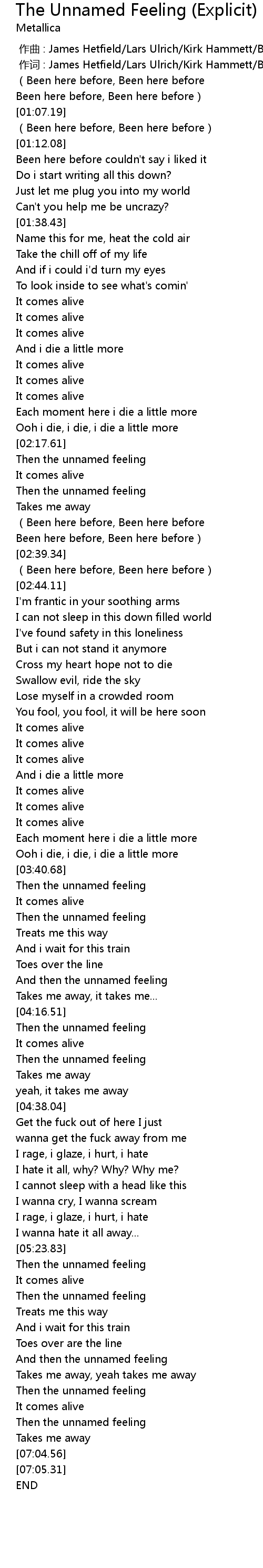 | [00:01.00] | zuò cí : James Hetfield Lars Ulrich Kirk Hammett Bob Rock |