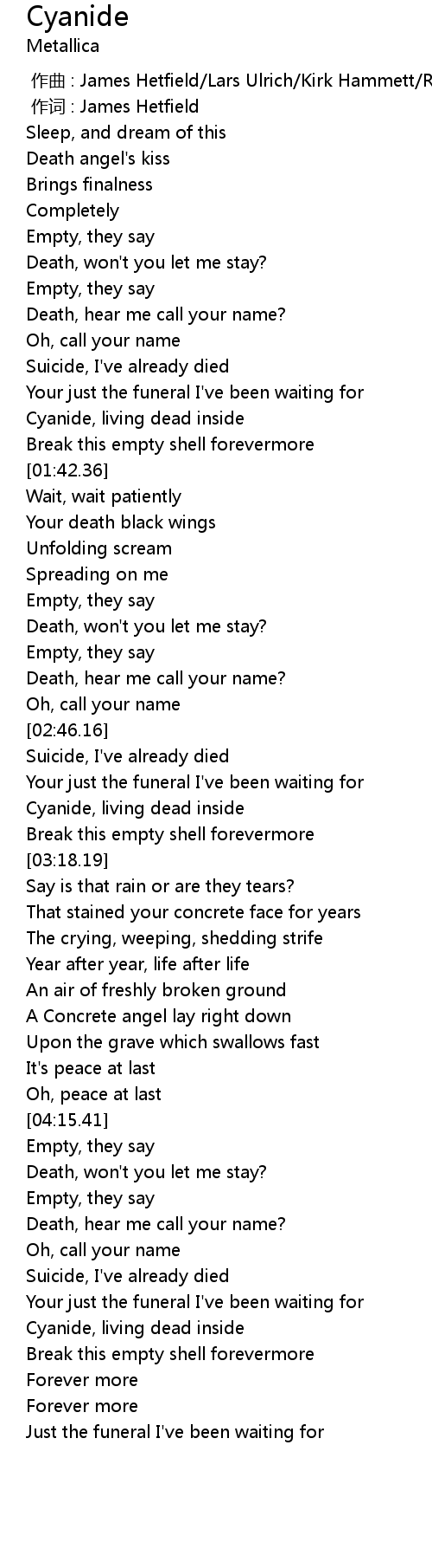 | [02:54.76] | Cyanide, living dead inside |
