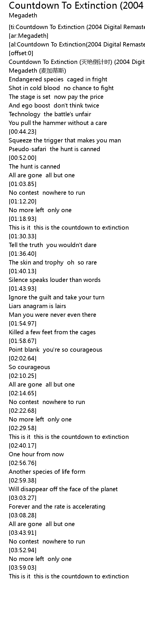| [00:00.00] | Countdown To Extinction (灭绝倒计时) (2004 Digital Remaster) - Megadeth (麦加蒂斯) |