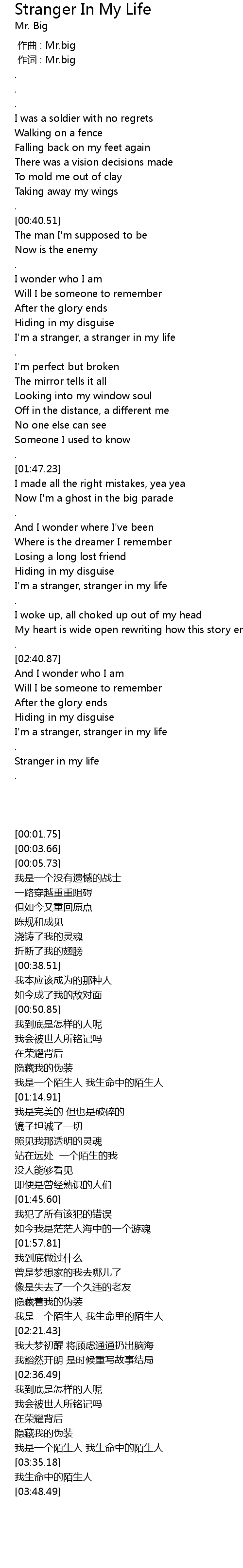 | [02:15.49] | I'm a stranger, stranger in my life |