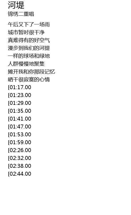| [02:59.00][01:23.00] | 也有一段长长的河堤 |