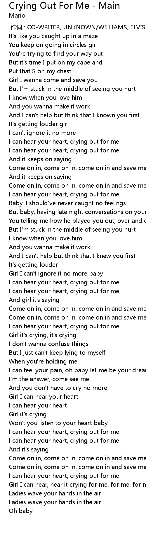 | [03:25.34] | Girl I can hear, hear it crying for me, for me, for me, for me |
