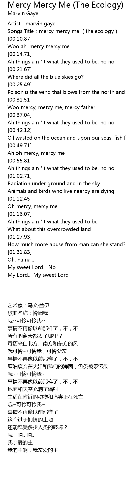 | [00:04.92] | Songs Title: mercy mercy me the ecology |