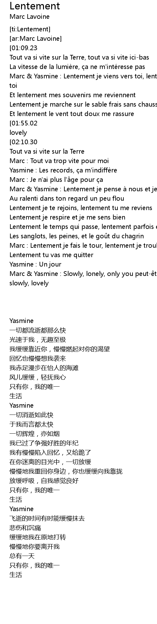 | [02:57.85] | Marc Yasmine : Slowly, lonely, only you peut tre ma che rie, slowly, lovely |