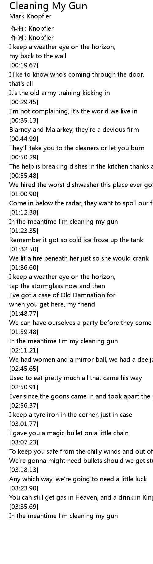 | [03:39.47] | In the meantime I' m cleaning my gun |