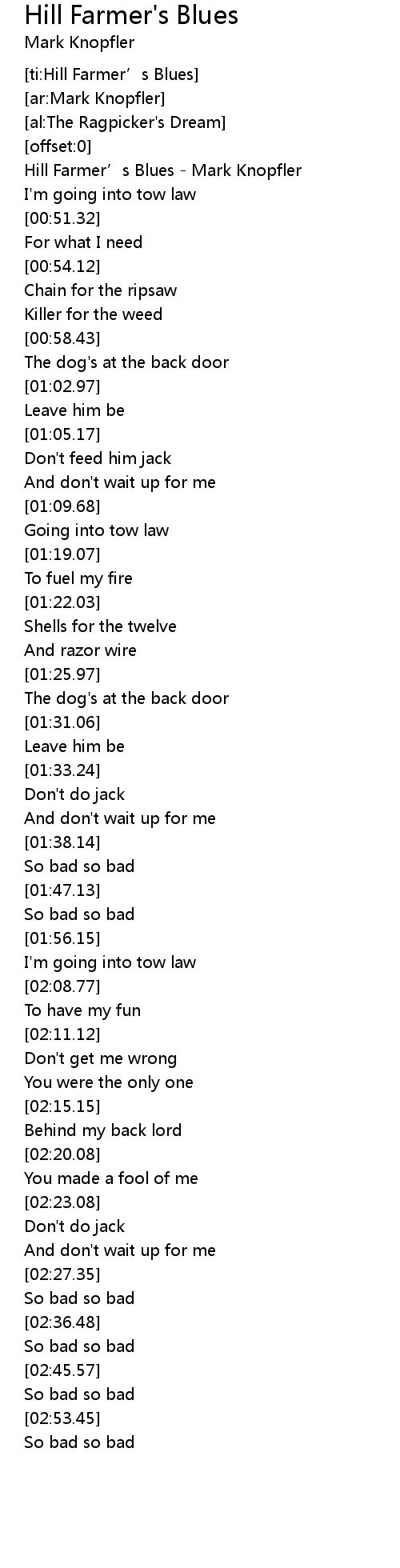 | [00:03.61] | Hill Farmer' s Blues Mark Knopfler |