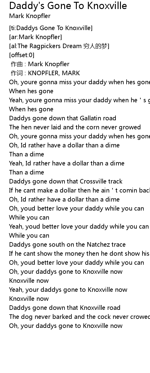 | [02:14.33] | Oh, your daddys gone to Knoxville now |