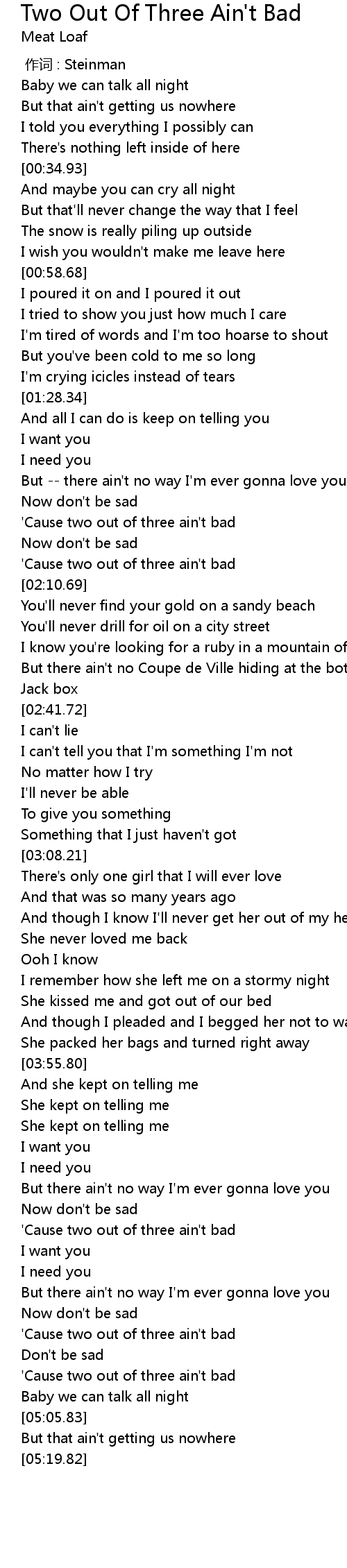 | [01:53.70] | ' Cause two out of three ain' t bad |