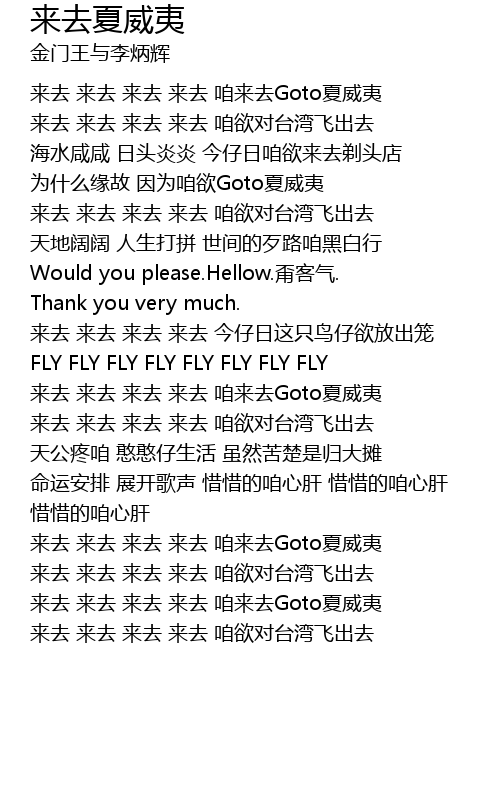 | [00:13.190] | 来去 来去 来去 来去 咱来去Goto夏威夷 |