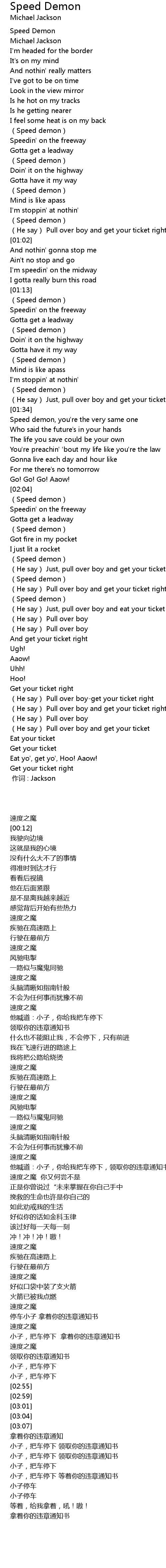 | [01:40] | Speed demon, you' re the very same one |