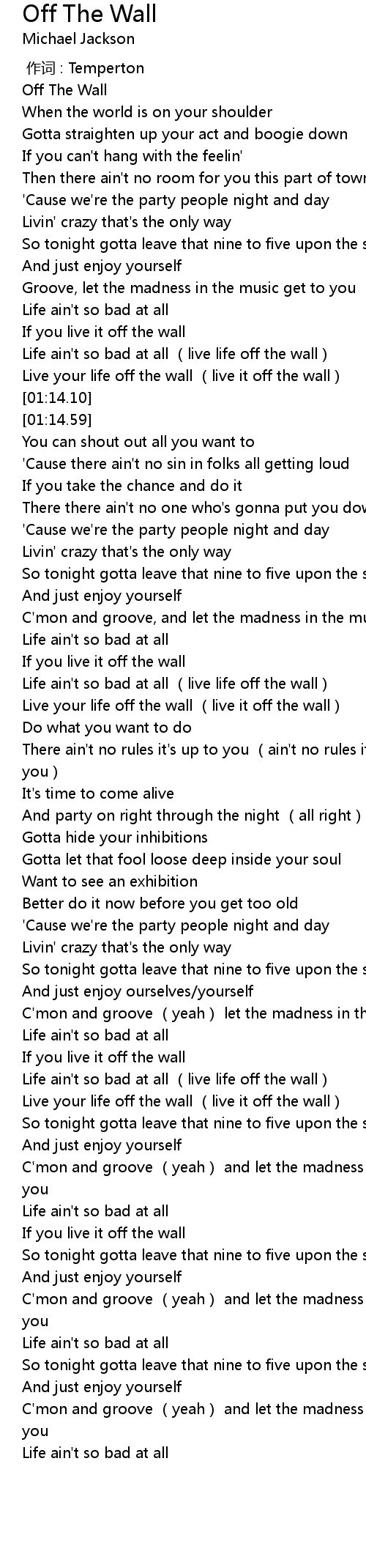| [01:13.60] | Live your life off the wall live it off the wall |