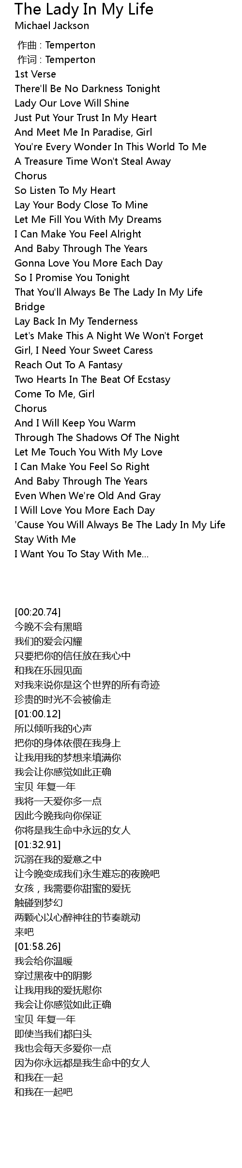 | [02:20.87] | ' Cause You Will Always Be The Lady In My Life |