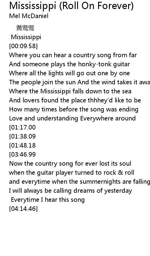 | [04:02.08][03:46.99][02:09.64] | Mississippi roll along Until the end of time |