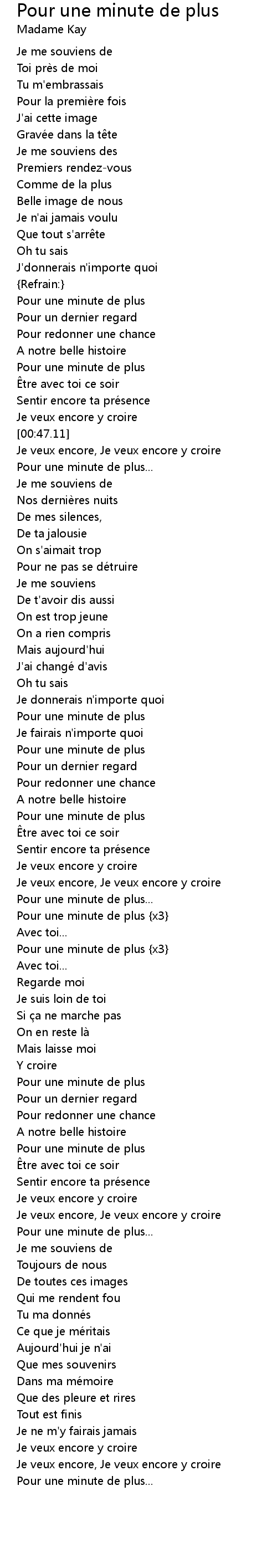 | [02:04.38] | Pour une minute de plus {x3} |